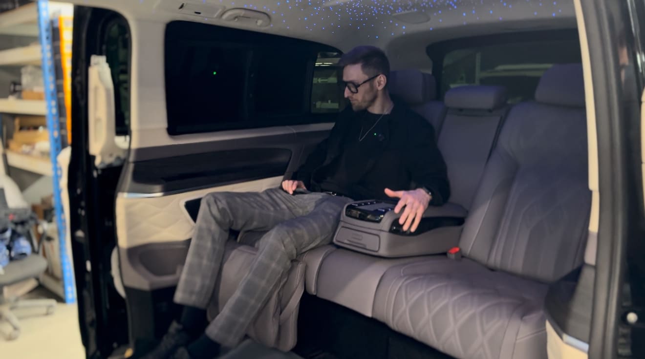 Наша задача была амбициозной: превратить стандартный салон Mercedes-Benz V300 в полноценный VIP-офис на колёсах, где одинаково комфортно работать, отдыхать и принимать гостей.